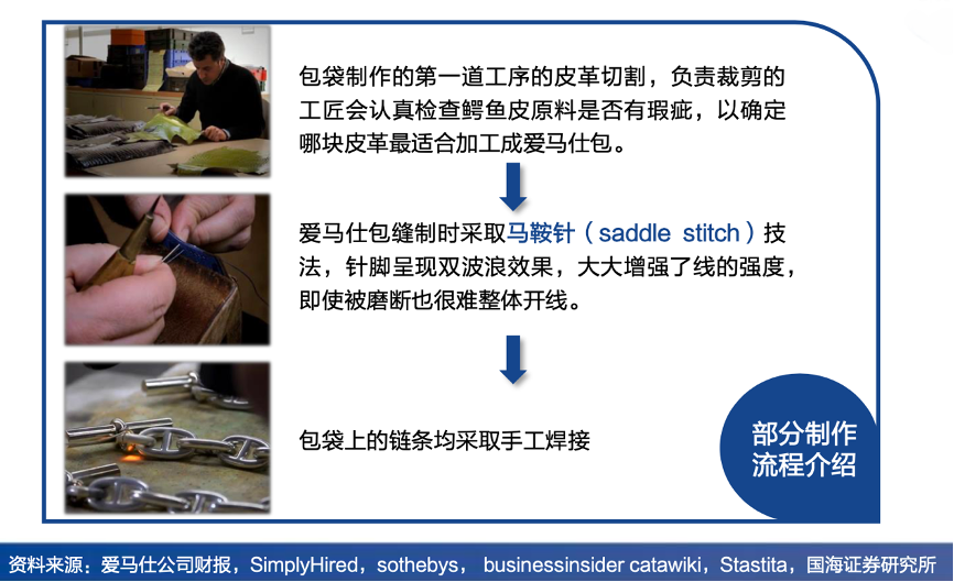 經(jīng)典案例:根據(jù)愛馬仕公司財報、SimplyHired、sothebys、businessinsider catawiki、Stastita、國海證券研究所等綜合資訊表明,愛馬仕始終堅持精心手工制作每一件包袋和絲綢,以滿足客戶的個性化定制需求。由于整個制作流程均由人工完成,制作一個Kelly包平均約需要 25小時,一個Birkin包至少需要18小時,一個制造廠每月僅能生產(chǎn)15只 愛馬仕包。