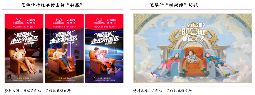 經(jīng)典案例:根據(jù)芝華仕官網(wǎng)、國聯(lián)證券研究所等綜合資訊表明,2019年公司在長沙舉辦“芝華仕歡聚日時髦癱春夏大秀”,這是國內(nèi)首場同時結(jié)合了“時髦”、“癱”、“沙發(fā)”的獨特走秀,并攜手四大時尚媒體 VOGUE、 ELLE、時尚芭莎、嘉人開啟“時髦癱”,推進(jìn)沙發(fā)與時尚的跨界。