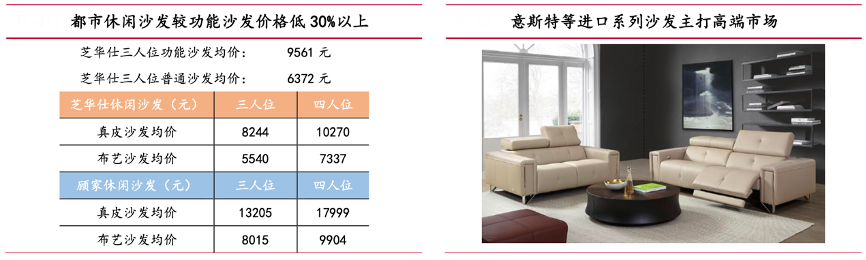 經(jīng)典案例:根據(jù)芝華仕天貓、芝華仕官網(wǎng)、國聯(lián)證券研究所等綜合資訊表明,以三人位為例,天貓旗艦店中都市休閑沙發(fā)價格較功能沙發(fā)低 33%左右,敏華控股公司頭等艙功能沙發(fā)、都市休閑沙發(fā)性價比突出,與顧家家居功能沙發(fā)和休閑沙發(fā)系列產(chǎn)品價格相比較低。為補充高端市場產(chǎn)品,公司布局意斯特意式功能沙發(fā)、意之堡意大利中高端布藝功能沙發(fā)、歐勒德德式智能家居等產(chǎn)品系列,實現(xiàn)中端高端市場全覆蓋。