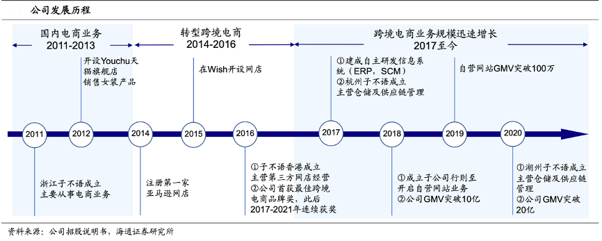 經(jīng)典案例:根據(jù)公司招股說明書、海通證券研究所等綜合資訊表明,2018年子不語(yǔ)公司成立自營(yíng)網(wǎng)站,同年其所有銷售渠道 GMV 突破 10 億元,2020 年公司 GMV 超 20 億元,按于北美產(chǎn)生的 GMV 計(jì),在中國(guó)跨境 B2C 電商鞋服市場(chǎng)商家中排名第一。