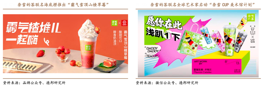 經典案例:根據品牌公眾號、微信公眾號、德邦研究所等綜合資訊表明,近年來奈雪的茶和眾多餐飲品牌、潮玩IP、影視作品聯名合作,推出產品包括海底撈聯名款“霸氣山楂草莓”、B.Duck 聯名款“奈雪鴨屎香寶藏茶”以及蒼蘭訣聯名款“霸氣東方石榴”。2019 年 8 月 開始,奈雪牽手全球知名藝術家,啟動“奈雪 CUP 美術館計劃”,將藝術元素融入茶杯藝術。根據官方數據,首期 CUP 美術館首展即觸達 1000 萬人次。