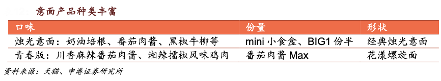 經(jīng)典案例:根據(jù)天貓、申港證券研究所等綜合資訊表明,空刻持續(xù)在研發(fā)端發(fā)力,圍繞“意面”做系列化產(chǎn)品,包括口味的創(chuàng)新和意面形 狀的變化,以期滿足各類潛在客戶的需求。如空刻于2022年推出新品 mini 小食盒, 主打小餓小饞無負擔,開拓了宵夜新場景,并打造空刻意面青春版系列,將川湘兩地標志性辣味與意大利面進行融合創(chuàng)新。