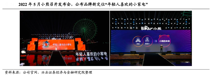 經(jīng)典案例:根據(jù)公司官網(wǎng)、興業(yè)證券經(jīng)濟(jì)與金融研究院等綜合資訊表明,2022 年 5 月 20 日,小熊舉辦戰(zhàn)略升級(jí)發(fā)布會(huì),正式將品牌定位進(jìn)一步升級(jí)為“年輕人喜歡的小家電”,同時(shí)提出新定位下的四大產(chǎn)品策略:創(chuàng)新多元、精致時(shí)尚、小巧好用、輕松可及,在堅(jiān)持高性價(jià)比及高顏值設(shè)計(jì)的產(chǎn)品定位基礎(chǔ)上,明確核心 用戶群體并以數(shù)字化建設(shè)賦能,加強(qiáng)消費(fèi)者需求洞察,從用戶使用場(chǎng)景出發(fā),不斷優(yōu)化全渠道立體式覆蓋及全流程服務(wù)體系。