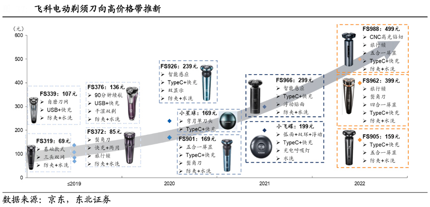 經(jīng)典創(chuàng)新案例:根據(jù)京東、東北證券等綜合資訊表明,2021 年飛科推出“小飛碟”繼續(xù)聚焦便攜式賽道,并進(jìn)一步推出星空智 能感應(yīng)剃須刀,拓展中高價(jià)格帶,使得中高端占剃須刀收入占比達(dá) 20%+;2022年飛科繼續(xù)依托小飛碟系列放量,同時(shí)推出多款高端手持式剃須刀,應(yīng)用智能感應(yīng)、旅行鎖等多種升級(jí)技術(shù)將價(jià)格帶進(jìn)一步上探至400 元。