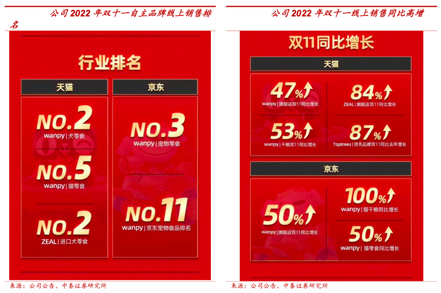 經(jīng)典案例:根據(jù)公司公告、中泰證券研究所等綜合資訊表明,中寵股份公司自上市以來(lái)先后投資領(lǐng)先寵物、華元德貝等聚焦線上的銷(xiāo)售公司,與阿里巴巴、京東、蘇寧易購(gòu)達(dá)成戰(zhàn)略合作。2022 年雙十一,Wanpy 銷(xiāo)售行業(yè)排名位居寵物零食第三名;Zeal行業(yè)排名位居進(jìn)口犬零食第二名;Toptrees 領(lǐng)先品牌銷(xiāo)售額較去年增長(zhǎng) 87%。