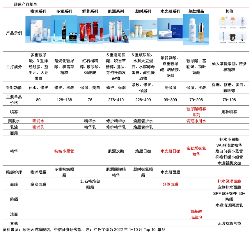 經(jīng)典案例:根據(jù)頤蓮天貓旗艦店、中信證券研究部等綜合資訊表明,頤蓮現(xiàn)擁有嘭潤、多重、鮮養(yǎng)、肌源、凝時(shí)、水光肌產(chǎn)品系列,同時(shí)開發(fā)了補(bǔ)水噴霧、元?dú)饩A、氨基酸潔顏泡、 玻尿酸調(diào)理冰川水等產(chǎn)品。品牌以玻尿酸+其他功效成分,覆蓋保濕、美白、抗老、修護(hù)等多個(gè)功效。在價(jià)格帶方面,頤蓮主要產(chǎn)品落在 80~200 元大眾價(jià)格區(qū)間。