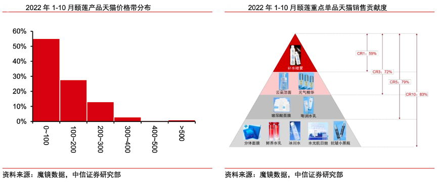 經(jīng)典案例:根據(jù)魔鏡數(shù)據(jù)、中信證券研究部等綜合資訊表明,從天貓平臺銷售來看,結(jié)合魔鏡數(shù)據(jù),頤蓮大多數(shù)銷售額來自 200 元以下價(jià)格區(qū)間。2022 年 1~10 月,從產(chǎn)品角度看,補(bǔ)水噴霧為頤蓮絕對大單品,2022年 1~10 月收入貢獻(xiàn)約 59%。