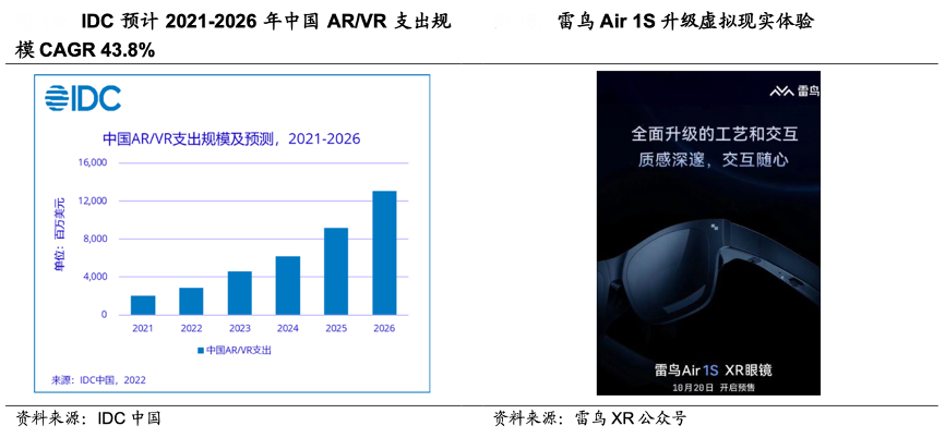 經(jīng)典案例:根據(jù)IDC中國、雷鳥XR公眾號、國海證券研究所等綜合資訊表明,從 AR 眼鏡到 VR 一體機(jī)再到 XR 視頻直播平臺建設(shè),黑電企業(yè)積累底層技術(shù)支持元宇宙形態(tài)。TCL 電子孵化雷鳥創(chuàng)新專注 AR 領(lǐng)域,2022 年 4 月雷鳥上市定位于消費(fèi)級娛樂大屏智能眼鏡產(chǎn)品雷鳥Air,后與元宇宙工具平臺 720 云達(dá)成戰(zhàn)略合作,圍繞 XR 內(nèi)容生態(tài)建設(shè)展開合作,10月發(fā)布雷鳥 Air 眼鏡的升級版 Air 1S。2022年“雙 11”期間雷鳥 AR 眼鏡在天貓+京東雙平臺 AR 品類總銷量/總銷額雙第一, 銷售額環(huán)比 618 全周期提升484%。