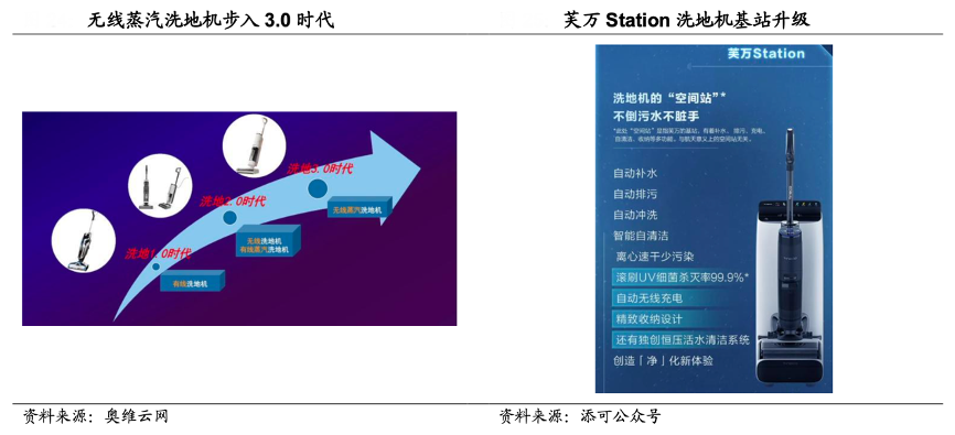 經(jīng)典案例:根據(jù)奧維云網(wǎng)、添可公眾號、國海證券研究所等綜合資訊表明,無線蒸汽洗地機(jī)開啟行業(yè) 3.0 時(shí)代,基站自動化升級解決清洗痛點(diǎn)。1)無線蒸汽洗地機(jī):2022 年 8 月安克創(chuàng)新子品牌悠飛馬赫推出無線蒸汽洗地機(jī) V1 Ultra, 隨后追覓推出 T12,添可推出芙萬 Steam2.0,實(shí)現(xiàn)高溫清潔除菌,針對性解決 養(yǎng)寵一族、重度清潔愛者、精致寶媽等核心用戶需求,有望進(jìn)一步打開市場。2) 基站升級:人工排污換水始終是洗地機(jī)產(chǎn)品的痛點(diǎn),無法真正解放雙手。2022年 9 月發(fā)布芙萬 Station 洗地機(jī)“空間站”,實(shí)現(xiàn)自動補(bǔ)水、排污、沖洗、自清潔等新功能。