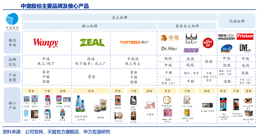 經(jīng)典案例:根據(jù)公司官網(wǎng)、天貓官方旗艦店、申萬宏源研究等綜合資訊表明,中寵股份公司逐步形成了以頑皮、Zeal、領(lǐng)先為核心的自主品牌矩陣,三者合計(jì)貢獻(xiàn)公司 80%以上的境 內(nèi)營收。其將三大核心自主品牌采用差異化品牌定位,頑皮為大眾品牌,定位中端,產(chǎn)品品類最廣,以“鮮”為品牌標(biāo)簽;Zeal 為高端品牌,定位一線城市,以“新西蘭原裝進(jìn) 口”、“天然”為核心賣點(diǎn)。