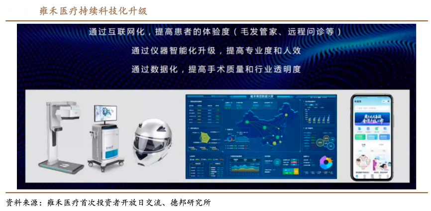 經典案例:根據(jù)雍禾醫(yī)療首次投資者開放日交流、德邦研究所等綜合資訊表明,雍禾是首家建立數(shù)據(jù)分析系統(tǒng)的民營毛發(fā)服務提供商,且是截止目前唯一一家可實時獲取患者人數(shù)、植發(fā)手術數(shù)量及毛囊移植數(shù)量資料的連鎖醫(yī)療機構。數(shù)據(jù)展示提升了醫(yī)療服務的透明度,進而提升患者治療體驗。
