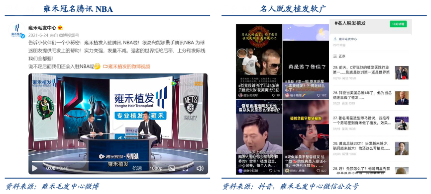 經(jīng)典案例:根據(jù)雍禾毛發(fā)中心、抖音、雍禾毛發(fā)中心微信公眾號(hào)、華創(chuàng)證券等綜合資訊表明,現(xiàn)今行業(yè)獲客成本仍然高企,2018~2021H1 雍禾公司銷(xiāo)售費(fèi)用率平均值為 51.3%,處于較高水平。2021H1 公司冠名騰訊 NBA 賽事并投放小視頻等,銷(xiāo)售費(fèi)用率提高至 54.8%,凈利率水平隨之拉低。