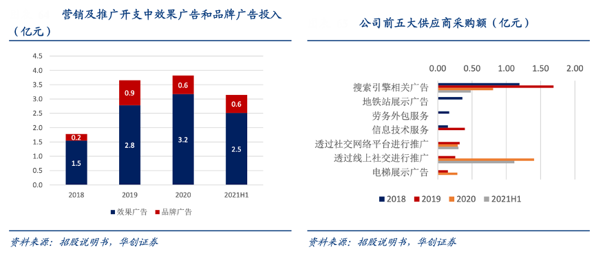 經(jīng)典案例:根據(jù)招股說(shuō)明書(shū)、華創(chuàng)證券等綜合資訊表明,雍禾銷(xiāo)售費(fèi)用中營(yíng)銷(xiāo)及推廣開(kāi)支占近 7 成,其中線上渠道占比營(yíng)銷(xiāo)推廣費(fèi)用近 8 成,主要以 效果廣告為主,2020年公司投入效果廣告 3.2 億元,占總營(yíng)銷(xiāo)費(fèi)用約40.7%。根據(jù)公司披露的前五大供應(yīng)商,公司主要投放搜索引擎類(lèi)廣告和線上社交廣告,百度、微博、嗶哩嗶哩和抖音為公司主要的投放平臺(tái),品 牌廣告占總營(yíng)銷(xiāo)費(fèi)用比重則從 2018 年的 5.0%提升至 21H1 的 11.0%。