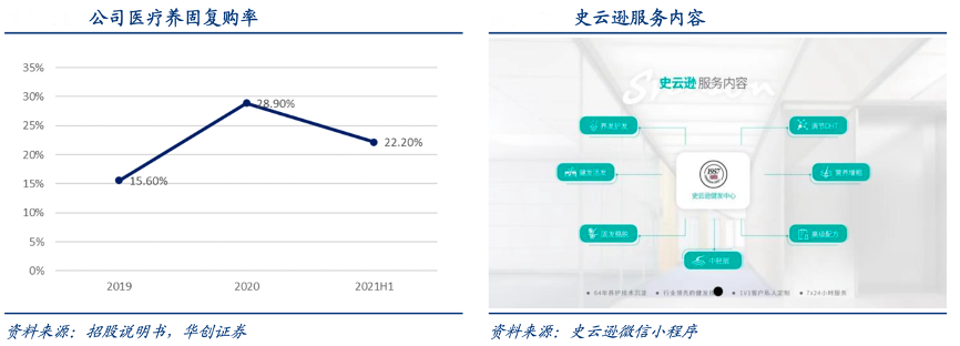 經(jīng)典案例:根據(jù)招股說明書、史云遜微信小程序、華創(chuàng)證券等綜合資訊表明,雍禾對于暫時不需要植發(fā)的患者,通過提供醫(yī)療養(yǎng)固服務(wù)也可以完成到店轉(zhuǎn)化,且目前已有一定比例的客戶為植發(fā)前養(yǎng)護(hù),養(yǎng)固與植發(fā)相互導(dǎo)流,形成閉環(huán)。當(dāng)前公司醫(yī)療養(yǎng)固業(yè)務(wù)復(fù)購率介于 20-30%之間,2020年全年為 28.9%,21H1 為 22.2%,因大部分預(yù)付費(fèi)套餐為 2 年內(nèi)使用完畢,因此復(fù)購率會有一定波動。