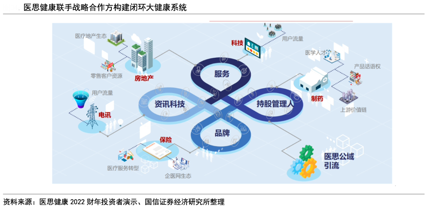 經(jīng)典案例:根據(jù)醫(yī)思健康官方公眾號、國信證券經(jīng)濟(jì)研究所等綜合資訊表明,醫(yī)思健康公司 2022 年 6 月與房地產(chǎn)投資管理公司凱龍瑞集團(tuán)及亞洲聯(lián)合基建控股有限公司成立合資公司,公司出資占合資公司已擴(kuò)大發(fā)行股本總額的 30%。合資公司將在中國香港建設(shè)醫(yī)療級別專用大廈,醫(yī)思健康亦將取得大樓冠名權(quán),有助于提升品牌知名度。