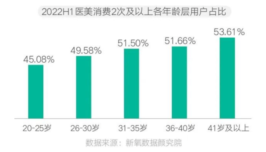 典型現(xiàn)象:根據(jù)新氧數(shù)據(jù)顏究院等綜合資訊表明,分年齡層來看,20-25 歲的用戶中,2022 年 H1 醫(yī)美消費(fèi) 2 次及 2 次以上的用 戶占比達(dá) 46.08%,26-30 歲年齡區(qū)間的用戶占比 49.58%,相比之下,31-35 歲的醫(yī) 美用戶中,有51.5%的用戶消費(fèi) 2 次及 2 次以上,41 歲及以上用戶的占比更是高 達(dá) 53.61%。