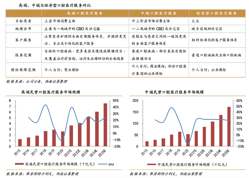 經(jīng)典案例:根據(jù)公司公告、弗若斯特沙利文、西南證券等綜合資訊表明,高端口腔醫(yī)療服務(wù)以更高的醫(yī)療標(biāo)準(zhǔn)與更佳的服務(wù)設(shè)施與私密度滿足成熟消費(fèi)者的期望。中端口腔醫(yī)療服務(wù)提供商通常以連鎖店的形式提供服務(wù),能夠搭建全面 客戶服務(wù)體系。高端民營口腔醫(yī)療服務(wù)市場在 2012 年為 12.9 億元,根據(jù) 沙利文預(yù)測,將于 2025 年達(dá)到 74.9 億元,CAGR 達(dá) 14.5%。