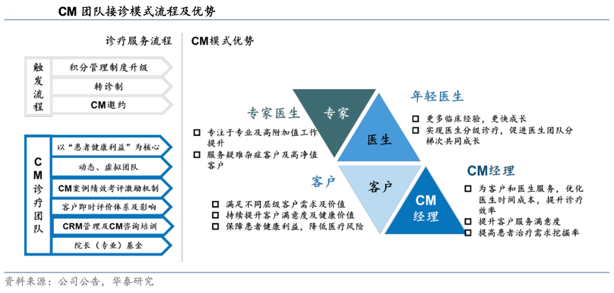 經(jīng)典案例:根據(jù)公司公告、華泰研究等綜合資訊表明,通策醫(yī)療公司以醫(yī)生為核心生產(chǎn)力進(jìn)行資源配置,積極推行以患者為中心的 CM(Case Manager)團(tuán)隊(duì)接診模式,通過分工將醫(yī)生時(shí)間更多分配至專業(yè)化程序,以實(shí)現(xiàn)分類管理、精準(zhǔn)服務(wù)的效果。