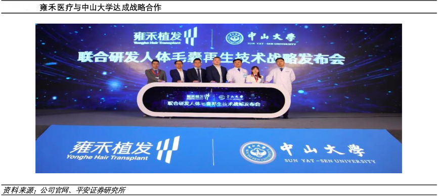 經(jīng)典案例:根據(jù)公司官網(wǎng)、平安證券研究所等綜合資訊表明,雍禾醫(yī)療與中山大學(xué)達成戰(zhàn)略合作,研究異體毛囊移植免疫排斥解決方案、新型預(yù)防焦慮誘導(dǎo)脫髮的小分子藥物開發(fā)、多功能型植髮手術(shù)床、溫和型泡沫洗髮水等,并初步取得成果。2021年,公司與四川大學(xué)華西醫(yī)院合作雄脫治療新靶點項目,進一步在防脫植發(fā)領(lǐng)域深耕。