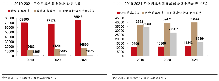 經(jīng)典案例:根據(jù)公司招股書、西部證券研發(fā)中心等綜合資訊表明,高客流量及出色的運(yùn)營(yíng)使美麗田園公司得以建立龐大的會(huì)員庫,并且活躍會(huì)員人數(shù)龐大,消費(fèi)能力高且粘性較高。2019年、2020年及2021年,公司活躍會(huì)員中的 80.7%、82.1%及 84.6%分別于當(dāng)年多次購買了公司服務(wù)。按活躍會(huì)員平均消費(fèi)來看,公司傳統(tǒng)美容服務(wù)的活躍會(huì)員平均消費(fèi)金額超過 1 萬元,醫(yī)療美容服務(wù)活躍會(huì)員平均消費(fèi)金額接近 4 萬元,均在業(yè)內(nèi)處于較高水平。