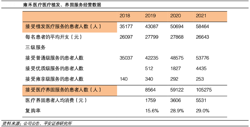經(jīng)典案例:根據(jù)公司公告、平安證券研究所等綜合資訊表明,通過全產(chǎn)業(yè)鏈的服務(wù)體系以及醫(yī)護(hù)人員服務(wù)能力的提升,雍禾醫(yī)療的患者人數(shù)不斷增加。接受植發(fā)醫(yī)療服務(wù)的患者人數(shù)從 2018 年 35177 人增長(zhǎng)至 2021 年 58464 人,3 年的復(fù)合增長(zhǎng)率為 18.45%;接受醫(yī)療養(yǎng)固服務(wù)的患者人數(shù)從 2019 年的 8564 人增長(zhǎng)至 2021 年的 105275 人,復(fù)合增速達(dá)到 250.61%。