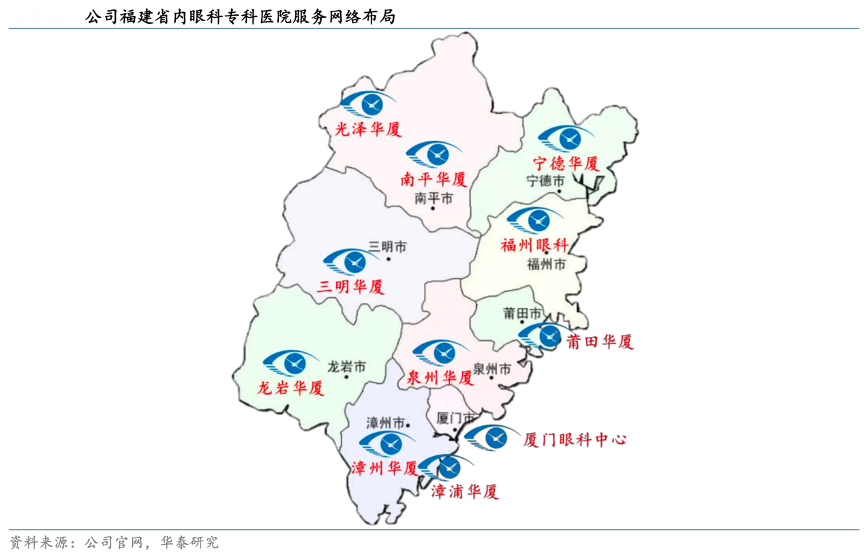 經(jīng)典案例:根據(jù)公司官網(wǎng)、華泰研究等綜合資訊表明,華廈眼科公司持續(xù)深耕福建省內(nèi)市場,除廈門眼科中心外,公司目前已在福建省內(nèi)建立了 10 家眼科??漆t(yī)院,提供包括白內(nèi)障、屈光、視光、基礎(chǔ)眼病等在內(nèi)的綜合性眼病診療服務(wù),并實現(xiàn)了針對福建省的全域覆蓋。其中,福州眼科醫(yī)院建院時間已超 11 年,目前已進入穩(wěn)健發(fā)展階段,成熟度相對較高。