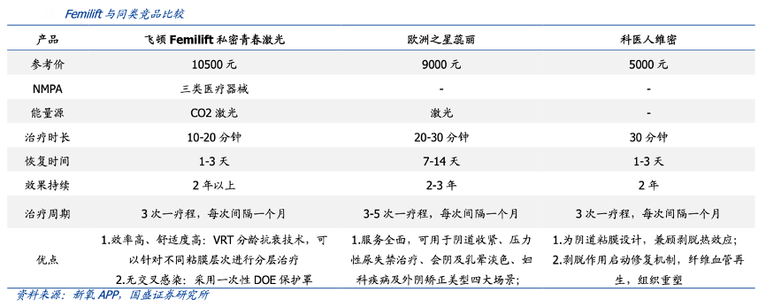 經(jīng)典案例:根據(jù)新氧APP、國(guó)盛證券研究所等綜合資訊表明,復(fù)銳醫(yī)療科技公司微創(chuàng)美容市場(chǎng)產(chǎn)品覆蓋多個(gè)領(lǐng)域,具體包括女性私密美容、抽脂、靜脈曲張治療。產(chǎn)品包括 FemiLift、BeautiFill by LipoLife 和 VascuLife。FemiLift 產(chǎn)品運(yùn)用 CO2 激光進(jìn)行女性私密健康修復(fù)治療,針對(duì)包括應(yīng)激性尿失禁、私密美容治療、產(chǎn)后修復(fù)、更年期后泌尿道綜合癥等問(wèn)題。