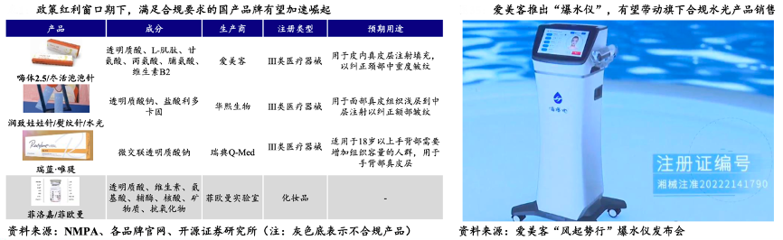 經(jīng)典案例:根據(jù)NMPA、各品牌官網(wǎng)、開源證券研究所、愛美客“風(fēng)起勢行”爆水儀發(fā)布會等綜合資訊表明,以往常有妝字號產(chǎn)品(如菲洛嘉)被用于水光針項目,愛美客布局水光儀,2022年5月6日愛美客于“風(fēng)起勢行”發(fā)布會上正式推出水光注射儀“爆水儀”,致力解決市面現(xiàn)有產(chǎn)品漏液多、注射速度慢、疼痛感強、噪音大等問題。