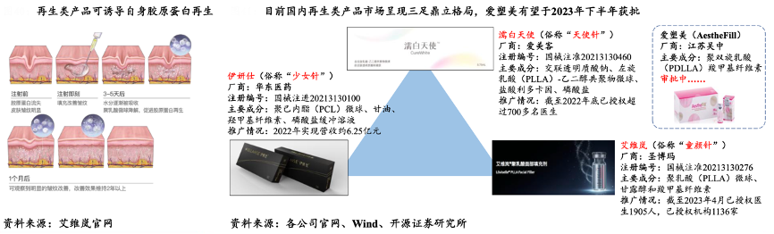 經(jīng)典案例:根據(jù)艾維嵐官網(wǎng)、各公司官網(wǎng)、wind、開源證券研究所等綜合資訊表明,目前我國市面上僅一款合規(guī)重組膠原蛋白填充劑(錦波生物旗下重組III型人源化膠原蛋白凍干纖維“薇旖美”),賽道仍是藍(lán)海,巨子生物、錦波生物、江蘇吳中等公司紛紛加碼布局。巨子生物現(xiàn)有4款在研重組膠原蛋白醫(yī)美植入劑,其中有兩款預(yù)計于2024Q1率先獲批,此外有一款交聯(lián)凝膠產(chǎn)品預(yù)計于2025H1獲批,有望在重組膠原蛋白填充劑領(lǐng)域構(gòu)筑先發(fā)優(yōu)勢。