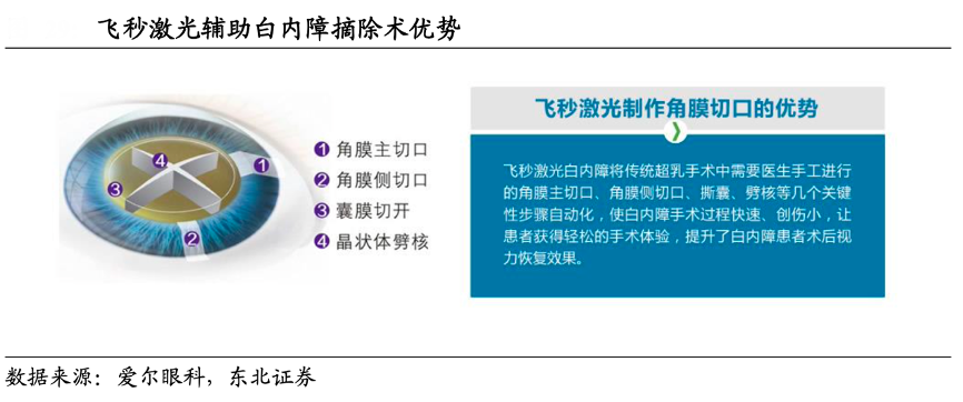 經(jīng)典案例:根據(jù)愛(ài)爾眼科、東北證券等綜合資訊表明,飛秒激光輔助白內(nèi)障摘除術(shù)在超聲乳化吸除術(shù)的基礎(chǔ)上優(yōu)化了切口、撕囊、預(yù)劈核等環(huán)節(jié),讓患者術(shù)后視覺(jué)質(zhì)量再上新臺(tái)階;雖然該技術(shù)發(fā)明時(shí)間較短,設(shè)備昂貴,手術(shù)定價(jià)較高,因此普及程度有限,但該術(shù)式更契合白內(nèi)障手術(shù)由復(fù)明性手術(shù)向屈光性手術(shù)發(fā)展的趨勢(shì),是白內(nèi)障手術(shù)客單價(jià)提升的發(fā)展方向之一。