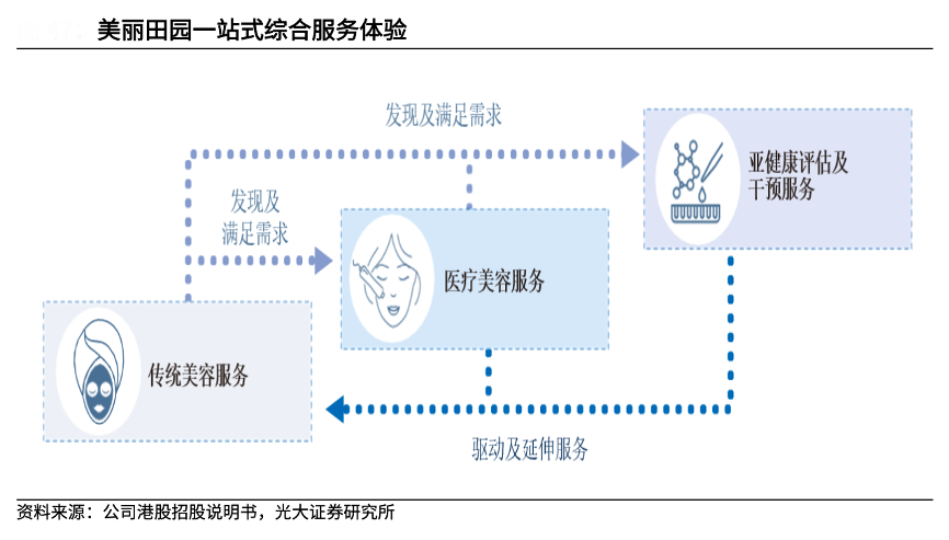 經(jīng)典案例:根據(jù)公司港股招股說(shuō)明書、光大證券研究所等綜合資訊表明,美麗田園2021-1H2022 期間,分別有21.7%及 21.2%的傳統(tǒng)美容服務(wù)會(huì)員購(gòu)買了醫(yī)療美 容服務(wù)或亞健康評(píng)估及干預(yù)服務(wù)。除生活美容會(huì)員向醫(yī)美服務(wù)及亞健康評(píng)估及干預(yù)服務(wù)轉(zhuǎn)介,醫(yī)美及亞健康服務(wù)的術(shù)前術(shù)后均存在日常護(hù)理和修復(fù)維穩(wěn)的需求,借此向生活美容 業(yè)務(wù)導(dǎo)流,提高生活美容消費(fèi)頻次。