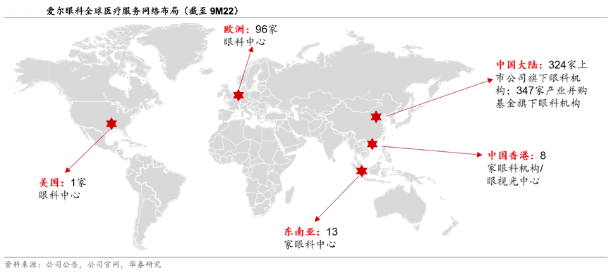 經(jīng)典案例:根據(jù)公司公告、公司官網(wǎng)、華泰研究等綜合資訊表明,愛爾眼科作為全球性眼科連鎖醫(yī)療機(jī)構(gòu),服務(wù)網(wǎng)絡(luò)遍布海內(nèi)外,截至 9M22,集團(tuán)旗下機(jī)構(gòu)數(shù)合計(jì)已達(dá) 789 家。截至 9M22,中國大陸共有 671 家眼科機(jī)構(gòu),其中上市公司旗下 324 家(其中眼科醫(yī)院 187 家,門診部 137 家),體外并購基金旗下 347 家(其中眼科醫(yī)院 312 家,門診部 35 家)。