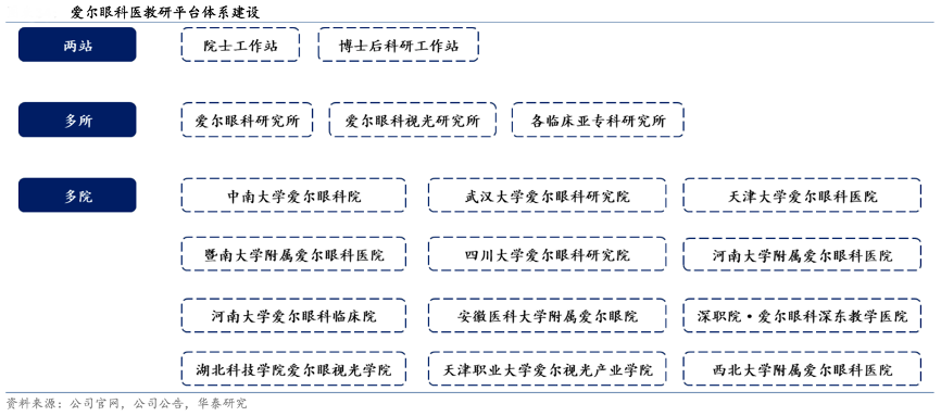 經(jīng)典案例:根據(jù)公司公告、公司官網(wǎng)、華泰研究等綜合資訊表明,愛爾眼科公司自 2013 年與中南大學(xué)聯(lián)合成立中南大學(xué)愛爾眼科學(xué)院后,其陸續(xù)推動(dòng)了與湖北科技學(xué)院、武漢大學(xué)、暨南大 學(xué)、安徽醫(yī)科大學(xué)、天津大學(xué)、四川大學(xué)等知名高校的戰(zhàn)略合作,公司目前已形成了以“多院”“多所”“兩站”為核心的醫(yī)教研體系,不斷為集團(tuán)輸出優(yōu)質(zhì)的眼科/眼視光醫(yī)生資源并提供良好的培養(yǎng)/培訓(xùn)平臺(tái)。