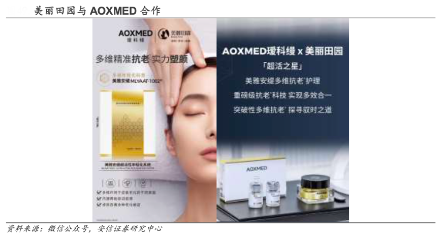 經(jīng)典案例:根據(jù)微信公眾號、安信證券研究中心等綜合資訊表明,美麗田園與 AOXMED 強強聯(lián)手,推出特色皮膚管理項目。2023 年 2 月 28 日,美麗田園宣布與貝泰妮旗下奢侈科技護膚品牌 AOXMED 合作推出“超活之星”美亞安緹多為抗老皮膚護理項目。通過與 AOXMED 強強聯(lián)手,實現(xiàn)項目賦能,進一步提升品牌知名度。