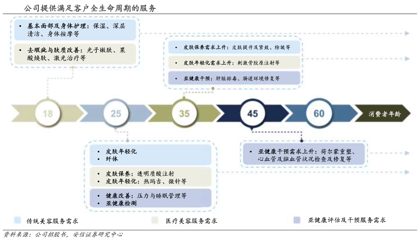 經(jīng)典案例:根據(jù)公司招股書、安信證券研究中心等綜合資訊表明,美麗田園公司最初主要業(yè)務(wù)為傳統(tǒng)美容服務(wù),憑借傳統(tǒng)美容服務(wù)初步獲得客戶信任,并通過研究客戶個人需求與市場趨勢,后續(xù)進(jìn)而延伸至 醫(yī)療美容服務(wù)以及亞健康評估及干預(yù)服務(wù)等更復(fù)雜的服務(wù),以為客戶提供更全面的服務(wù)。自此,公司形成了傳統(tǒng)美容服務(wù)、輕醫(yī)美服 務(wù)、亞健康管理三位一體的有機(jī)服務(wù)平臺。