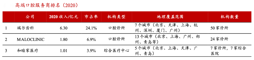 經(jīng)典案例:根據(jù)華西證券等綜合資訊表明,瑞爾齒科是瑞爾集團(tuán)旗下面向高端消費(fèi)者品牌,穩(wěn)坐高端口腔行業(yè)龍頭位置。成立于 1999 年,截至 2022 年 9 月 30 日,公司在國(guó)內(nèi) 7 個(gè)城市(北京、上海、深 圳、廣州、杭州、天津及廈門)共開設(shè)了 51 家瑞爾診所。從 2020 年總收入或綜合醫(yī)療中心口腔科 產(chǎn)生的收入來看,瑞爾齒科穩(wěn)居第一,達(dá)到 6.3 億元,遠(yuǎn)超其他民營(yíng)口腔機(jī)構(gòu)。