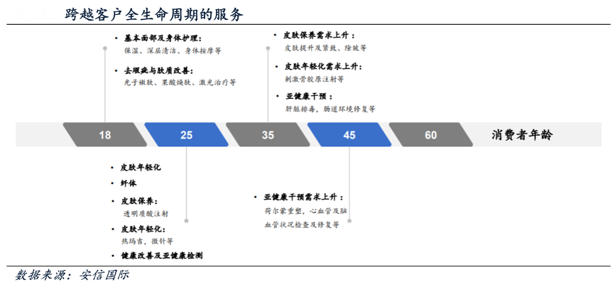 經(jīng)典案例:根據(jù)安信國際等綜合資訊表明,美麗田園公司主營傳統(tǒng)美容服務(wù)業(yè)務(wù),自 2011 年起進軍醫(yī)療美容服務(wù),打開第二條成長曲線,2018 年開始發(fā)展亞健康評估及干預(yù)服務(wù),開拓未來增長的第三大支柱。公司提供多樣化美麗與 健康管理服務(wù),涵蓋 47 類服務(wù)項目及超過 800 個SKU,跨越客戶全生命周期。