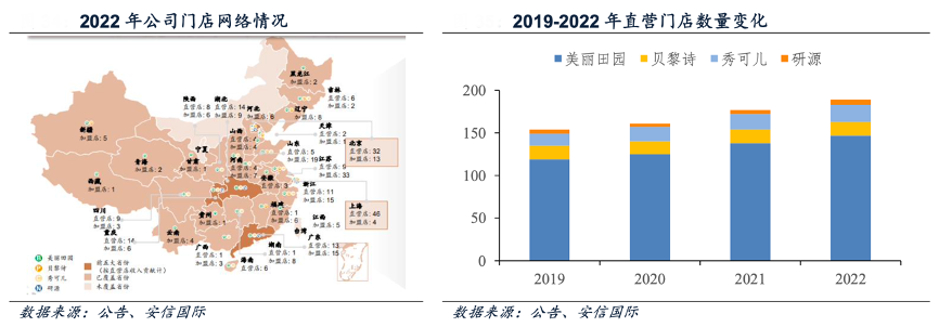 經(jīng)典案例:根據(jù)公告、安信國際等綜合資訊表明,2022年美麗田園公司已建立 189 家直營店和 189 家加盟店,覆蓋全國超 100 座城市。按照品牌劃分,美麗田園擁有 147 家直營店和 144 家加盟店,貝黎詩擁有 16 家直營店和45 家加盟店,秀可兒醫(yī)美和研源醫(yī)療分別擁有 20 和 6 家直營店,88.4%直營門店位于一線及新一線城市,處在黃金商業(yè)地段和核心物業(yè),服務(wù)于具備高消費能力的中高端客戶