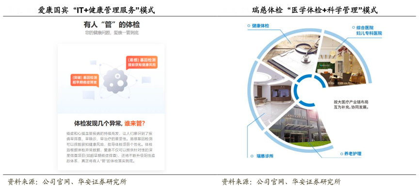 經(jīng)典案例:根據(jù)公司官網(wǎng)、華安證券研究所等綜合資訊表明,截至 2022 年底,美年健康+慈銘體檢市場份額約26%;愛康國賓位居第二,份額約 15%;瑞慈體檢以 3.3%的市場份額排名第三。各大機(jī)構(gòu)圍繞市場定位、資源整合、盈利模式、平臺戰(zhàn)略和價(jià)值創(chuàng) 造等領(lǐng)域加強(qiáng)商業(yè)模式創(chuàng)新。例如美年大健康通過參股收購模式整合資源、愛康國賓推出“IT+健康管理服務(wù)”模式、瑞慈提出“醫(yī)學(xué)體檢+科學(xué)管理”模式等。