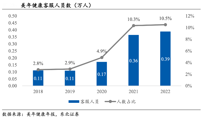 經(jīng)典案例:根據(jù)美年健康年報、東北證券等綜合資訊表明,美年健康高度重視客戶服務(wù)與客戶滿意度。公司客服人員數(shù)近 5 年增長顯著,22 年達(dá) 3900 人,為 18 年的 3.6 倍??头藛T在員工總?cè)藬?shù)的占比由 2.8%提升至10.5%,僅次于醫(yī)務(wù)人員與銷售人員。