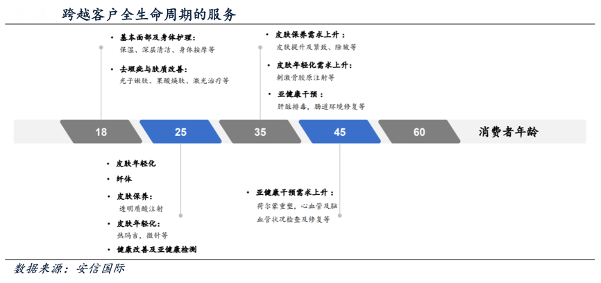 經(jīng)典案例:根據(jù)安信國(guó)際等綜合資訊表明,美麗田園公司主營(yíng)傳統(tǒng)美容服務(wù)業(yè)務(wù),自 2011 年起進(jìn)軍醫(yī)療美容服務(wù),打開(kāi)第二條成長(zhǎng)曲線,2018 年開(kāi)始發(fā)展亞健康評(píng)估及干預(yù)服務(wù),開(kāi)拓未來(lái)增長(zhǎng)的第三大支柱。公司提供多樣化美麗與 健康管理服務(wù),涵蓋 47 類服務(wù)項(xiàng)目及超過(guò) 800 個(gè) SKU,跨越客戶全生命周期。