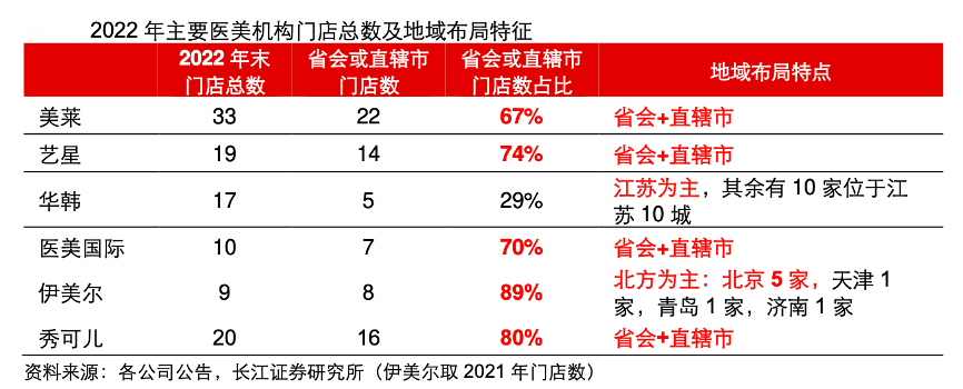 經(jīng)典案例:根據(jù)各公司公告、長(zhǎng)江證券研究所等綜合資訊表明,全國(guó)范圍內(nèi),醫(yī)美機(jī) 構(gòu)呈現(xiàn)低集中度,TOP1 品牌美萊市占率僅為 3.3%,品牌 CR5 僅為 6.3%;但區(qū)域內(nèi)集中度較高,據(jù)瑞麗醫(yī)美招股書披露,2019 年杭州和上海醫(yī)美機(jī)構(gòu)品牌 CR5 分別達(dá)到 30%、38%,頭部機(jī)構(gòu)品牌門店或選擇集中布局于省會(huì)及直轄市(例如美萊、藝星、醫(yī)美國(guó)際、秀可兒),或選擇深耕某一區(qū)域形成標(biāo)桿性龍頭單店(例如華韓股份、伊美爾)。