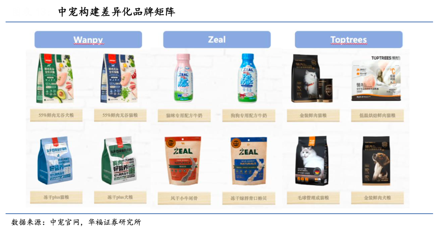 經(jīng)典案例:根據(jù)中寵官網(wǎng)、華福證券研究所等綜合資訊表明,中寵股份公司制定“聚焦國內(nèi)市場、聚焦自主品牌、聚焦主糧產(chǎn)品”的戰(zhàn)略,大力發(fā)展自有品牌,根據(jù)不同市場的競爭環(huán)境和渠道屬性,通過不同品牌切入不同細分市場,滿足終端消費者的多元化需求,目前公司已成功構(gòu)建高、中、低檔的差異化品牌矩陣。2023 年 6 月,ZEAL 和 GREAT JACK’S 正式進駐加拿大 156 家 PetSmart 門店,在北美市場 的銷售拓展取得新突破。