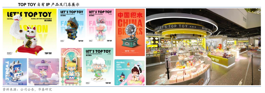 經(jīng)典案例:根據(jù)公司公告、華泰研究等綜合資訊表明,TOP TOY 品牌門店銷售的潮玩產(chǎn)品涵蓋盲盒、積木、手辦、拼裝模型、玩偶、一番賞、雕塑和其他潮玩共 8 大品類。截至 2023 年 6 月 30 日,TOP TOY 提供約 7,000 個(gè)SKU。不 同于以玩具反斗城為代表的傳統(tǒng)玩具零售商(大多僅銷售第三方品牌),TOP TOY 還通過(guò) IP 聯(lián)名、推出自有 IP 方式打造自有產(chǎn)品。