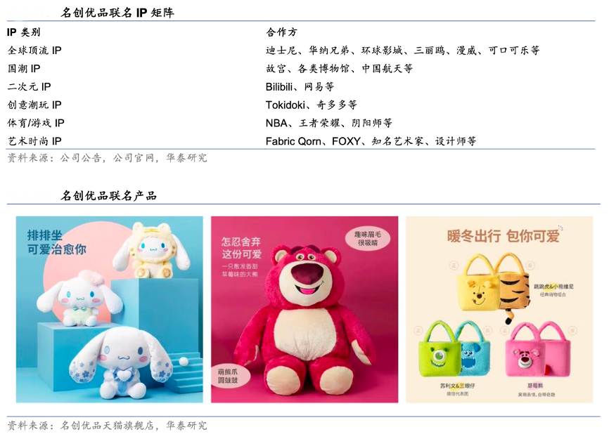 經(jīng)典案例:根據(jù)公司公告、公司官網(wǎng)、名創(chuàng)優(yōu)品天貓旗艦店、華泰研究等綜合資訊表明,2016 年以來名創(chuàng)優(yōu)品陸續(xù)和粉紅豹、Hello Kitty、芝麻街、Universal、迪士尼、故宮、NBA、漫威、中國航天、陰陽師、Bilibili 等知名 IP 推出聯(lián)名產(chǎn)品,截至 2023 年 6 月 30 日,名創(chuàng)優(yōu)品已與 82 個 IP 進(jìn)行聯(lián)名合作。