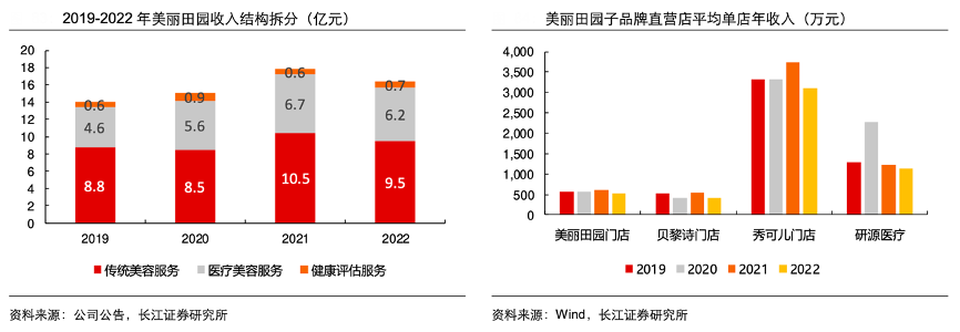 經(jīng)典案例:根據(jù)公司公告、wind、長江證券研究所等綜合資訊表明,2022 年,美麗田園公司醫(yī)美業(yè)務(wù)收入達 6.2 億 (占比 38%),相較 2019 年復(fù)合增長 10.1%,高于生美業(yè)務(wù)的 2.6%,雙美業(yè)態(tài)歷經(jīng)疫情三年收入仍維持正增且體量趨同,其核心在于多年深耕直營所積累的強大門店管理能力孵化出創(chuàng)收能力突出的優(yōu)質(zhì)單店,生美單店平均年收入中樞 500 萬左右,醫(yī)美單店年 均收入已高達 3000-3500 萬元,兩條腿走路模式逐步成型。