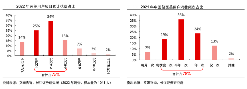 經(jīng)典案例:根據(jù)艾瑞咨詢、長(zhǎng)江證券研究所等綜合資訊表明,2022年醫(yī)美用戶人均累計(jì)消費(fèi)金額集中于 1-6 萬(wàn)元,消費(fèi)頻次集中于每年 1-2 次,高客單價(jià)+較低消費(fèi)頻次的行為特征使得消費(fèi)者對(duì)門店選址和交通距離的敏感性降低,因 而單店客群輻射范圍較大,承載能力強(qiáng)且口碑較好的醫(yī)院甚至吸引求美者跨省慕名就醫(yī)。