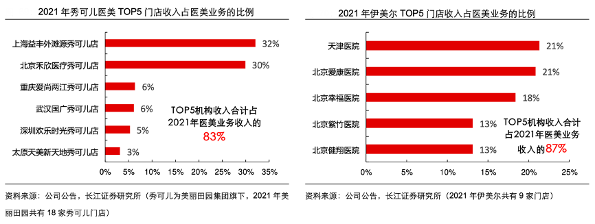 經(jīng)典案例:根據(jù)公司公告、長(zhǎng)江證券研究所等綜合資訊表明,從各家頭部醫(yī)美機(jī) 構(gòu)品牌的門店收入結(jié)構(gòu)來(lái)看,秀可兒醫(yī)美(美麗田園旗下)和伊美爾的 TOP5 門店收入 占比均超 80%,華韓整形 TOP3 門店收入占比達(dá) 64%,且各家 TOP1 醫(yī)院創(chuàng)收力強(qiáng),龍頭效應(yīng)突出。