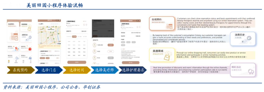 經(jīng)典案例:根據(jù)美麗田園小程序、公司公告、華創(chuàng)證券等綜合資訊表明,當前美麗田園公司數(shù)據(jù)平臺涉及區(qū)域發(fā)展模型、門店運營支持模型、 客戶分析模型、員工發(fā)展模型,其中客戶關系管理系統(tǒng)中涵蓋 96 項客戶標簽,用戶畫像 完整,利于挖掘客戶需求(如生美和醫(yī)美相互賦能)和喚醒沉睡客戶。2020 年初公司上線“美田在線”小程序,涵蓋線上預約、信息發(fā)布、營銷活 動、直播體驗、線上商城、服務回訪等,實現(xiàn)從預約→消費→服務反饋的閉環(huán)。
