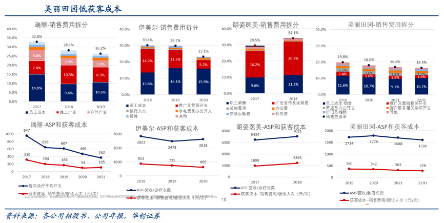 經(jīng)典案例:根據(jù)各公司招股書、公司年報、華創(chuàng)證券等綜合資訊表明,當前雙美模式下,美麗田園公司營銷費用率低于 20%,明顯低于大多醫(yī)美機構(gòu),體現(xiàn)公司精準獲客以 及渠道復用的價值和會員資產(chǎn)價值。從銷售費用拆分來看,美麗田園投放費用率顯著低于瑞麗、伊美爾、朗姿等醫(yī)美機構(gòu),美麗田園的推廣及營銷相關開支占比約2%;費用主要為員工成本,系生美渠道的銷售顧問。